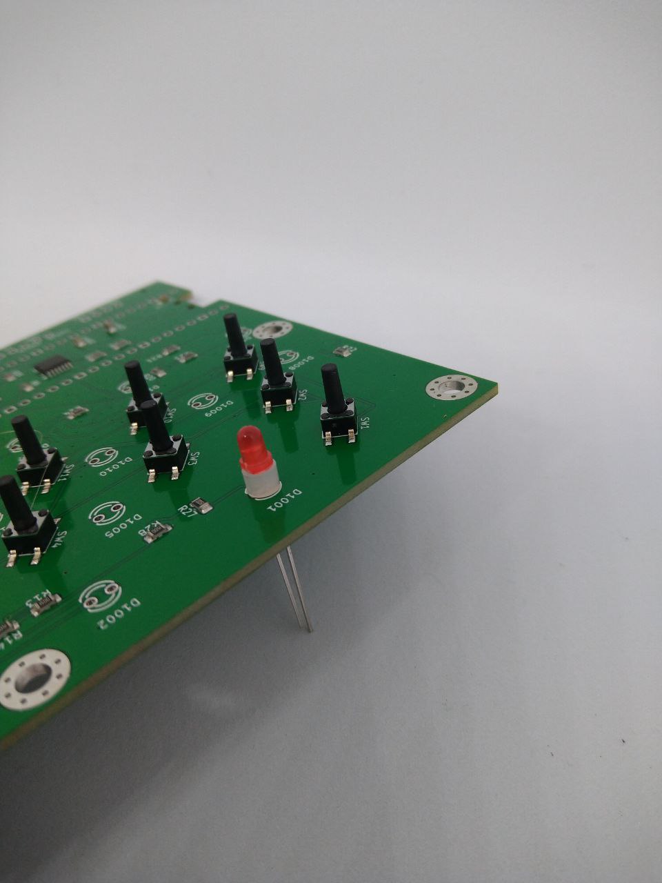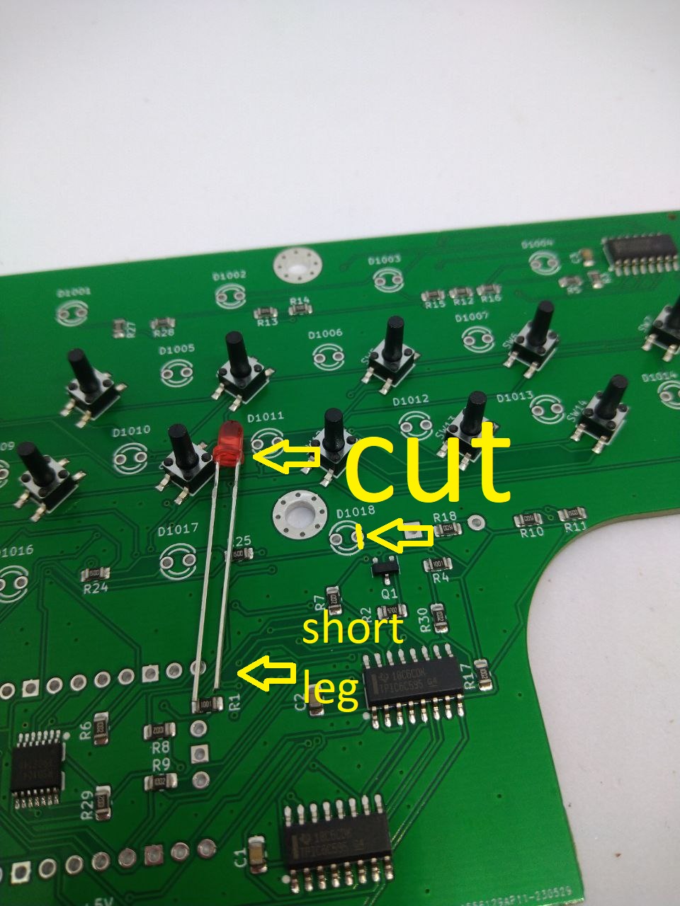 - solder front side LEDs. Don’t forget spacers. Align cut on the LED with barely visible cut on the silkscreen. To the right if looking from the front side.