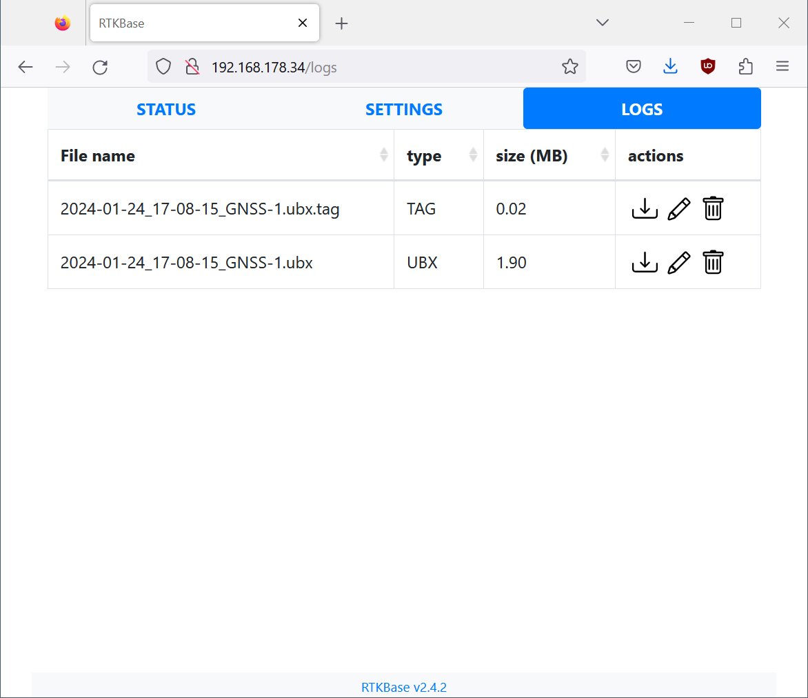 Start a browser and enter the IP address of your RTKBase. You will get this: