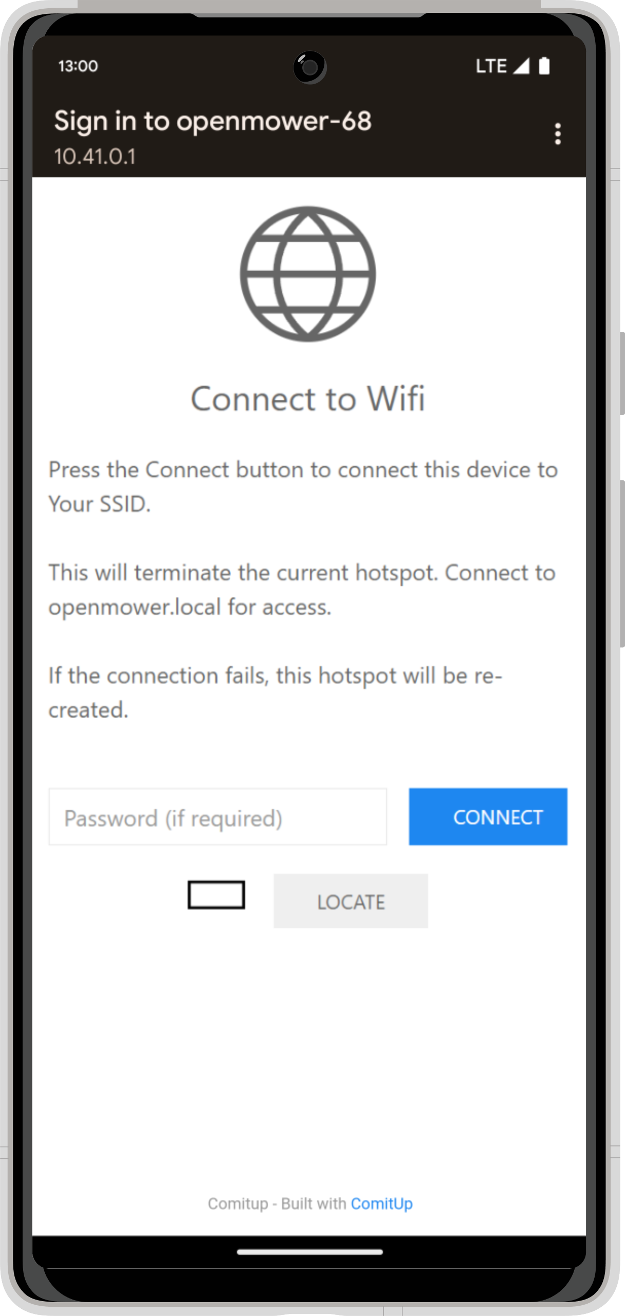 Turn your mower on and wait for the Raspberry Pi to boot. The next step is to connect the Robot to your Wi-Fi network. This way it can download and install the latest OpenMower software.
