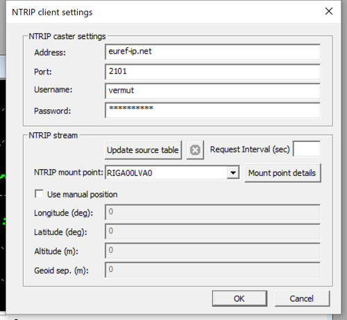 Now let’s connect NTRIP. We assume that you either found a suitable NTRIP node somewhere nearby (<30km) or running your own base station.