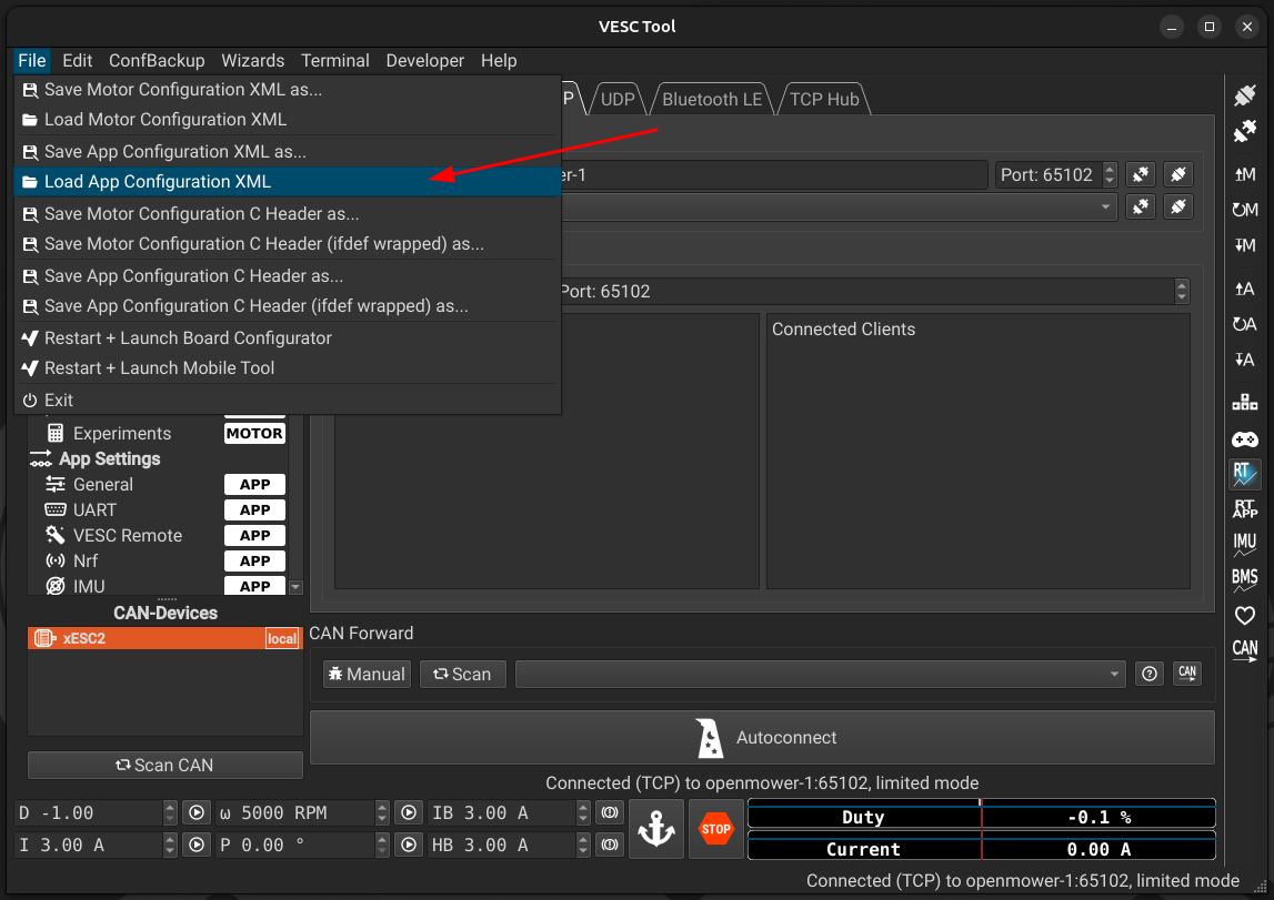 File -> Load Motor Configuration XML - [Image 2]: Select the motor configuration XML file for your motor (different for mowing motor and the drive motors)