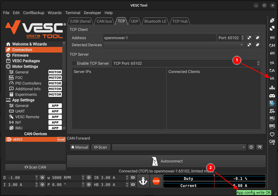Write App configuration. The green banner will appear on success. - Hit Ctrl + C in the openmower terminal to stop exposing the xESC controller.